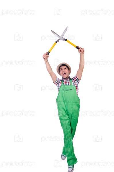 Забавный человек с ножницами на белом фоне