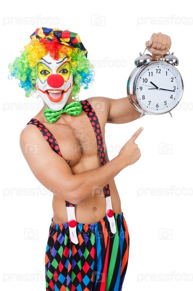 Клоун с будильником на белом фоне