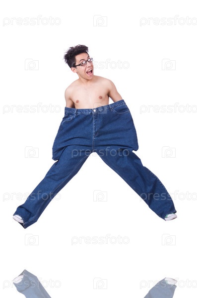 Забавный мужчина с брюками, изолированный на белом фоне