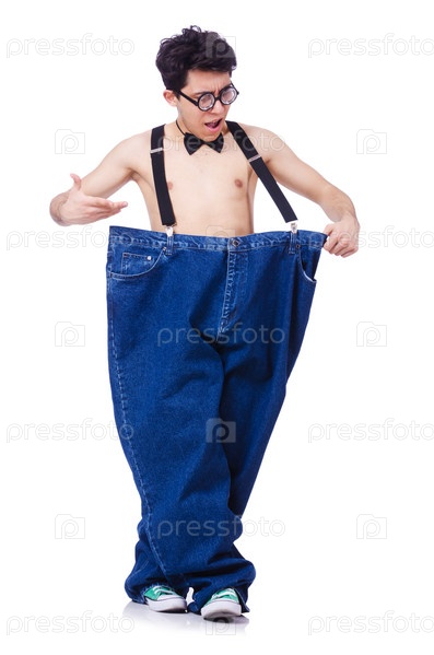 Забавный мужчина с брюками, изолированный на белом фоне