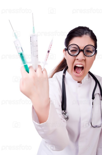 Женщина-врач с шприцами на белом фоне