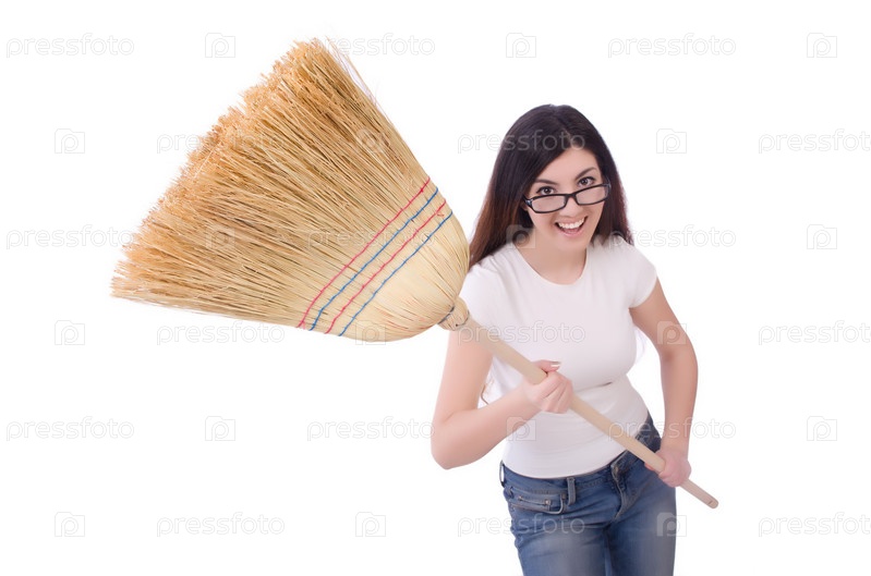 Молодая женщина с веником на белом фоне