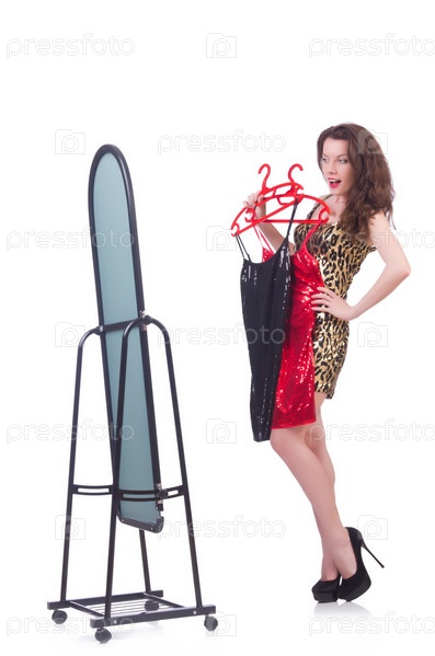 Женщина меряет одежду на белом фоне