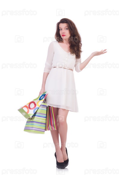 Высокая девушка после шопинга на белом фоне