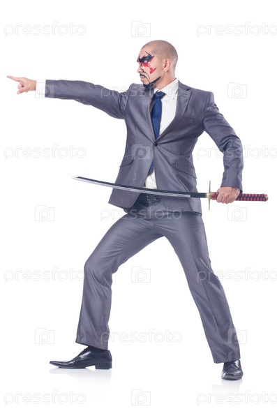 Бизнесмен с мечом, изолированный на белом фоне