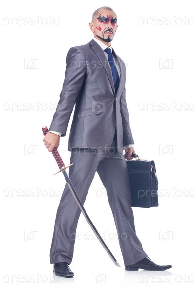 Бизнесмен с мечом, изолированный на белом фоне