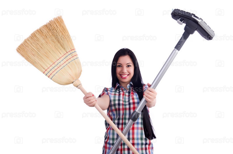 Молодая домохозяйка делает уборку на белом фоне