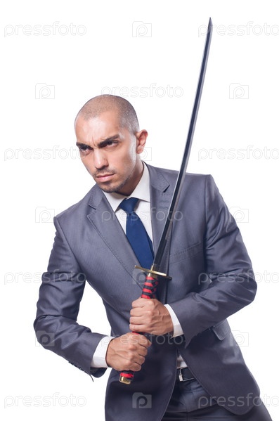 Бизнесмен с мечом, изолированный на белом фоне