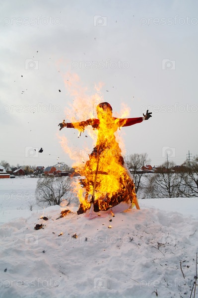 Горящее чучело Масленицы зимой на снегу