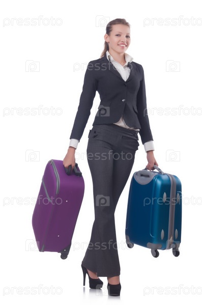 Бизнес-леди путешествует, изолировано на белом фоне