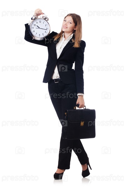 Бизнес-леди с часами, изолированная на белом фоне