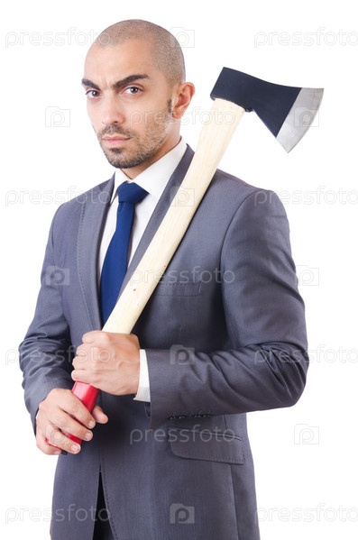 Смешной бизнесмен с топором на белом фоне