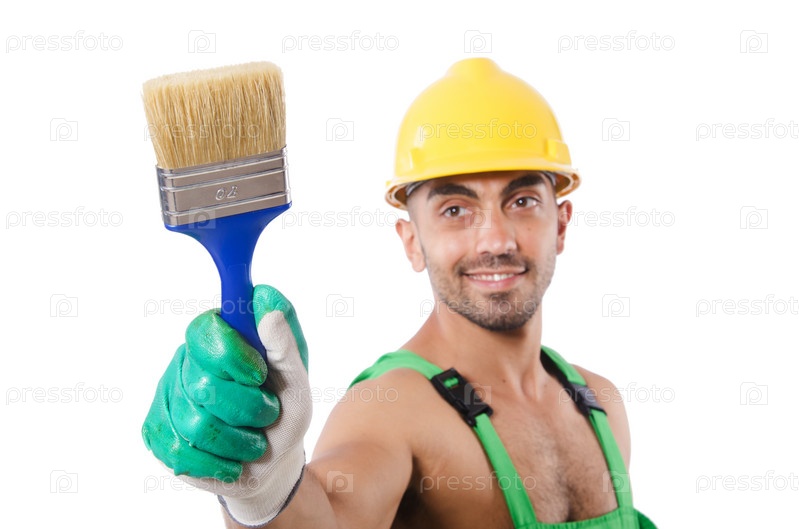 Маляр в зеленым комбинезоном на белом фоне