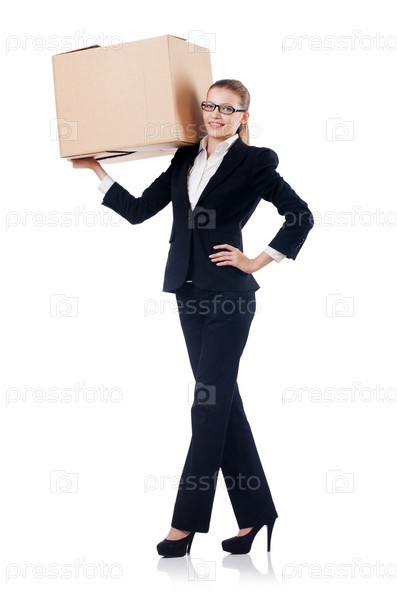 Деловая женщина с коробками на белом фоне