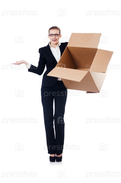 Деловая женщина с коробками на белом фоне