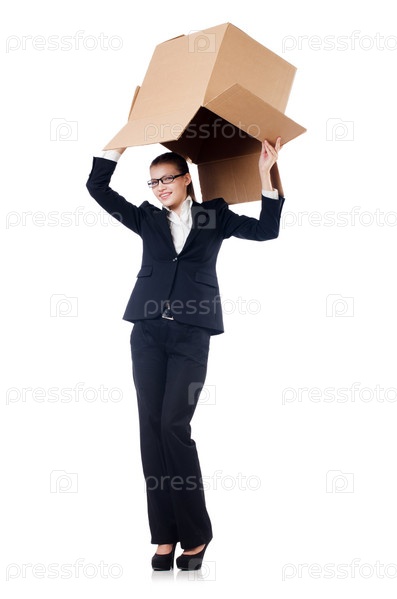 Деловая женщина с коробками на белом фоне