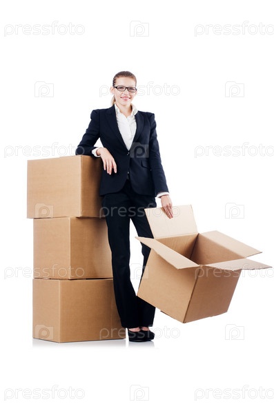 Деловая женщина с коробками на белом фоне
