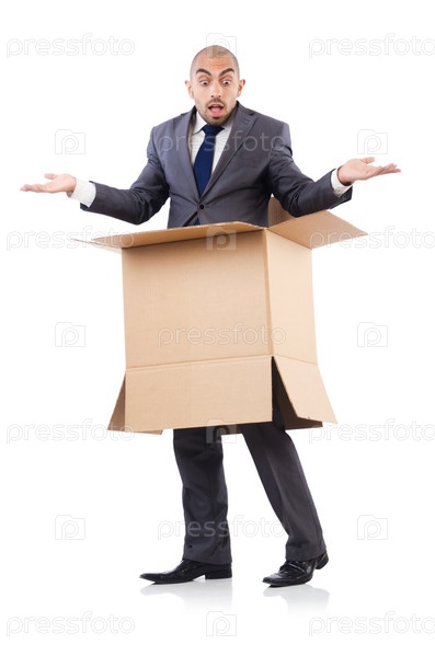 Бизнесмен с коробками, изолированный на белом