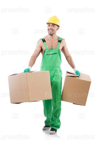 Человек в зеленом комбинезоне с коробками