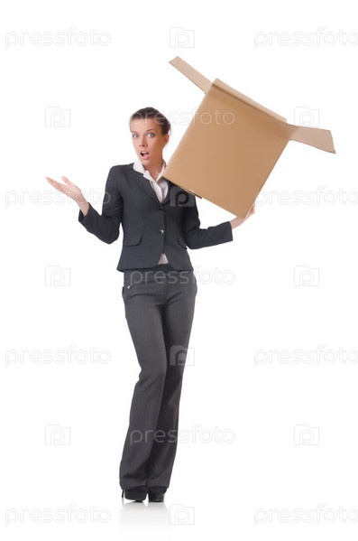 Бизнес-леди с коробкой на белом фоне