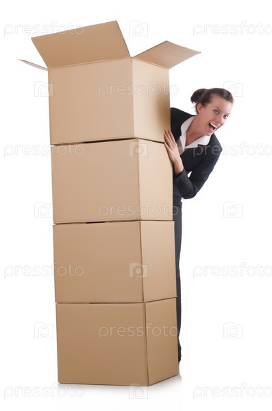 Бизнес-леди с коробкой на белом фоне