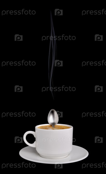 Принимая ложку для отдыха в чашке кофе на черном фоне