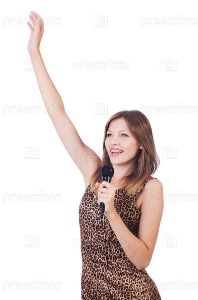Певица с микрофоном на белом фоне