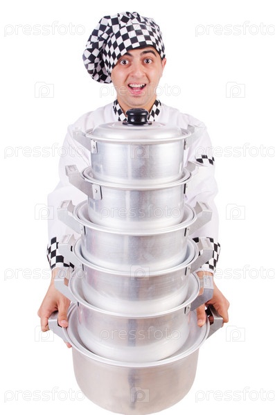 Повар с кастрюлями на белом фоне