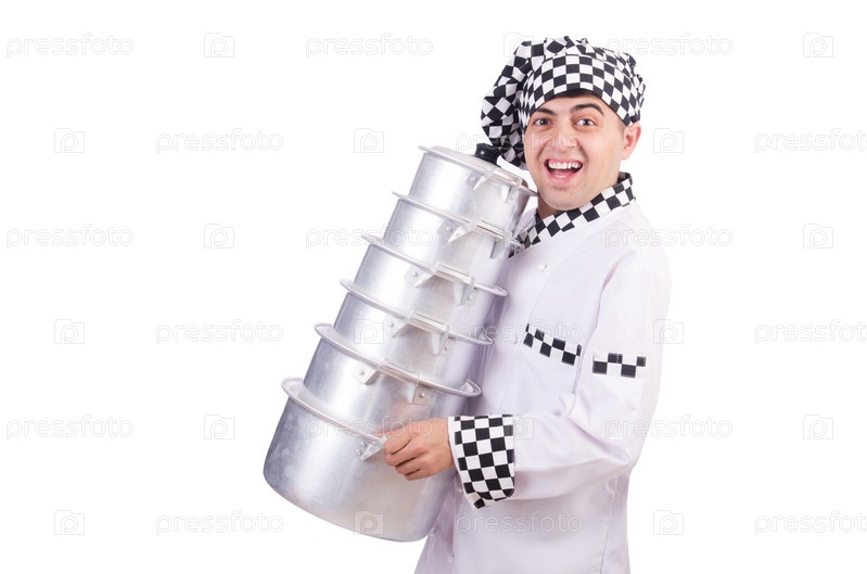 Повар с кастрюлями на белом фоне