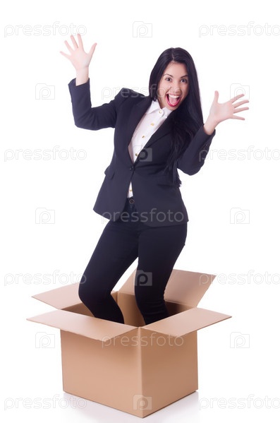 Женщина с коробкой на белом фоне