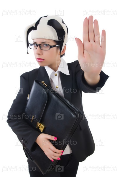 Бизнес-леди клоун, изолированная на белом фоне