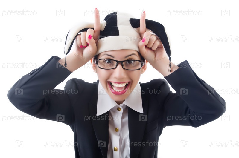 Бизнес-леди клоун, изолированная на белом фоне