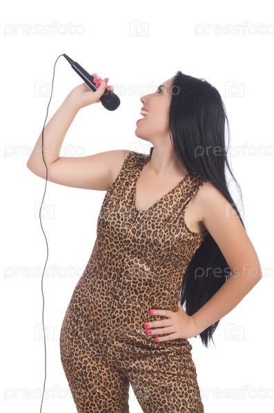 Певица с микрофоном на белом фоне