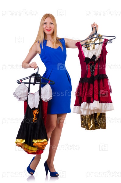 Женщина меряет новую одежду на белом фоне