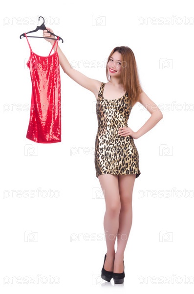 Женщина меряет новую одежду на белом фоне