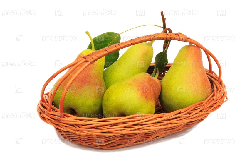 Большие спелые груши в плетеной корзине на белом фоне