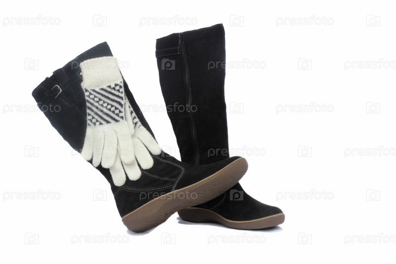 Черные женские зимние сапоги и белые перчатки