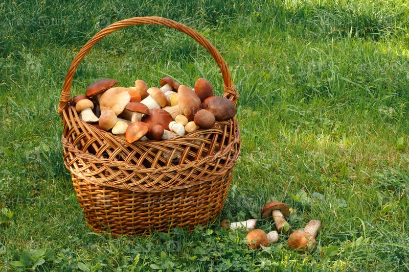 Плетеная корзина, полная грибов, на лесной поляне