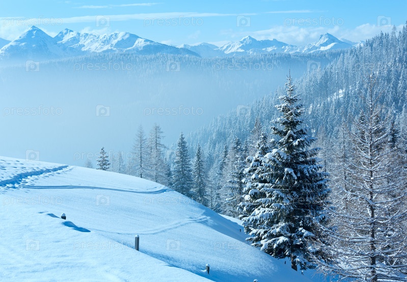 Утренние туманные горы, зимний пейзаж