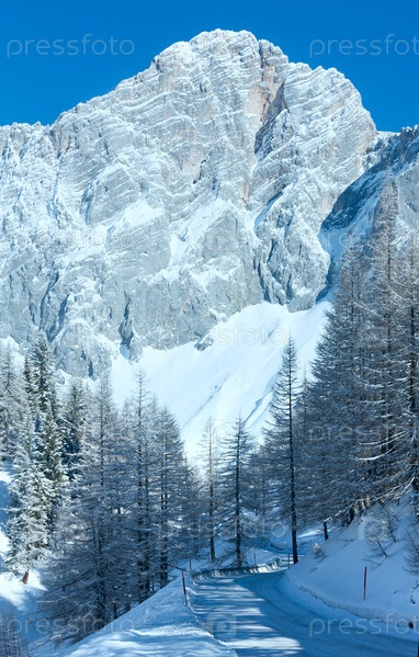 Зимняя скала со свежим снегом и альпийская дорога