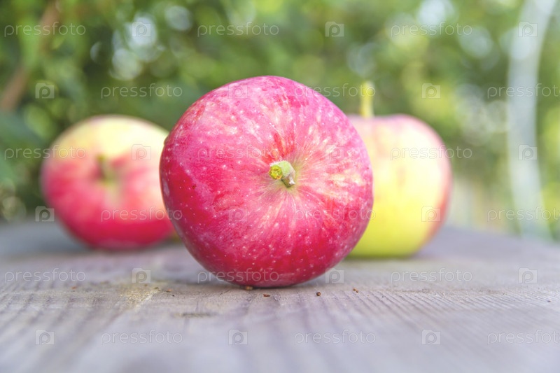 Красные яблоки на деревянном столе в саду
