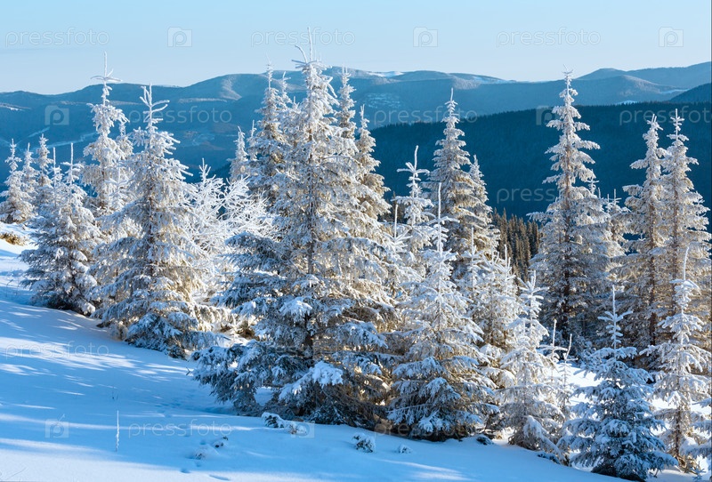 Восход солнца и снежные деревья на холме
