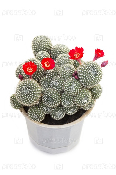 Цветущий кактус маммилярия, mammillaria, на белом фоне