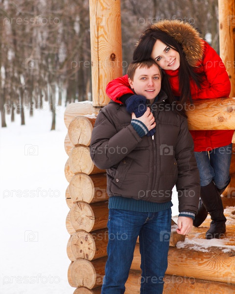 Счастливая молодая пара отдыхает в зимнем парке