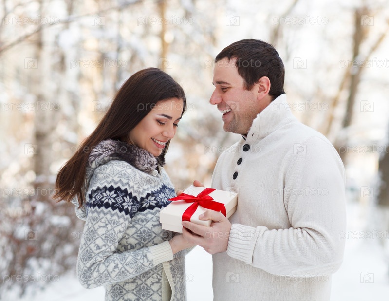 Счастливая молодая пара в зимнем парке