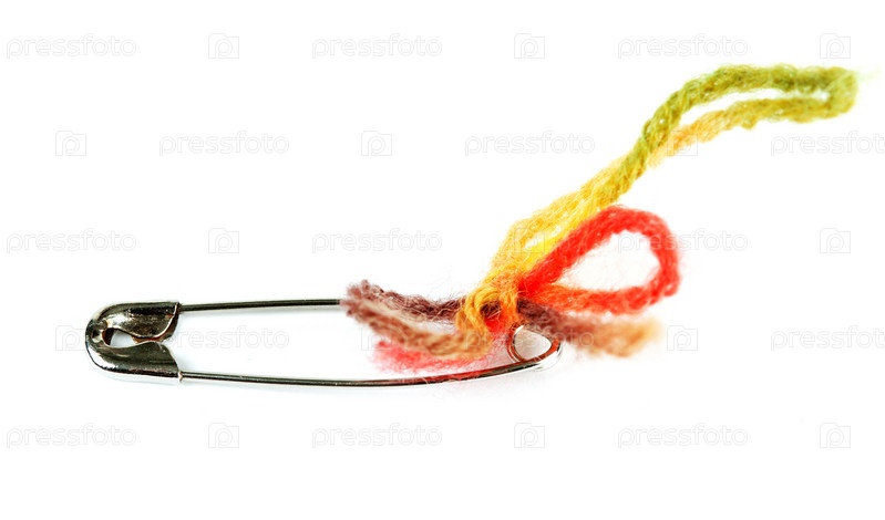 Булавка с цветной шерстяной нитью на белом фоне