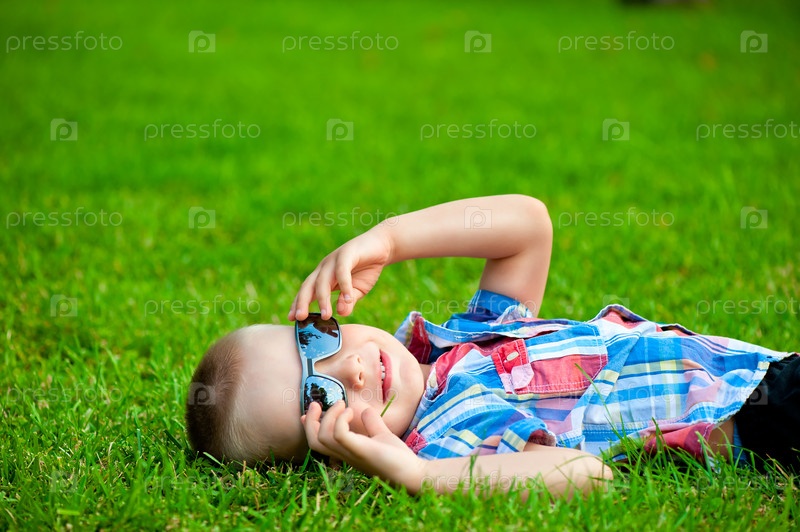 Счастливый мальчик отдыхает, лежа на зеленой траве в солнцезащитных очках