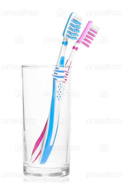 Пара новых зубных щеток в стакане на белом фоне