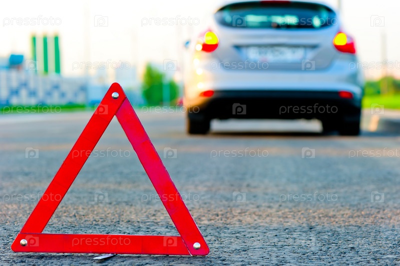 Красный предупреждающий треугольник и автомобиль на обочине дороги