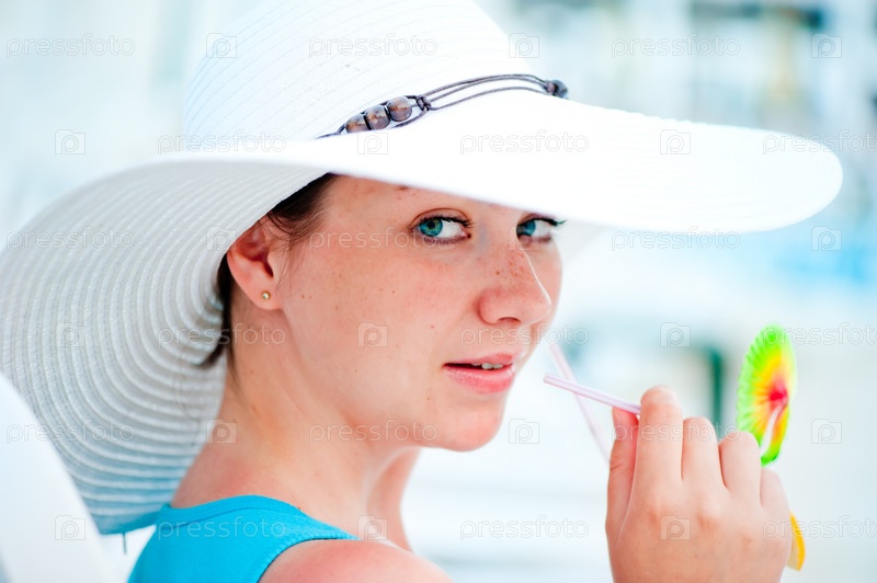 Молодая женщина в белой шляпе с бокалом алкогольного коктейля